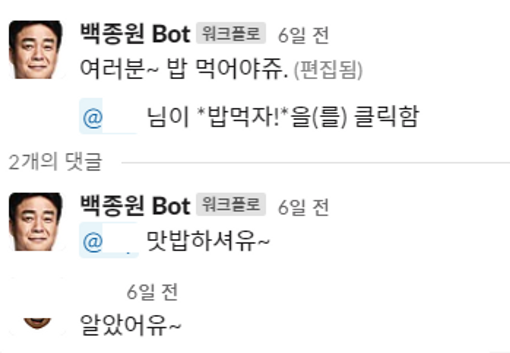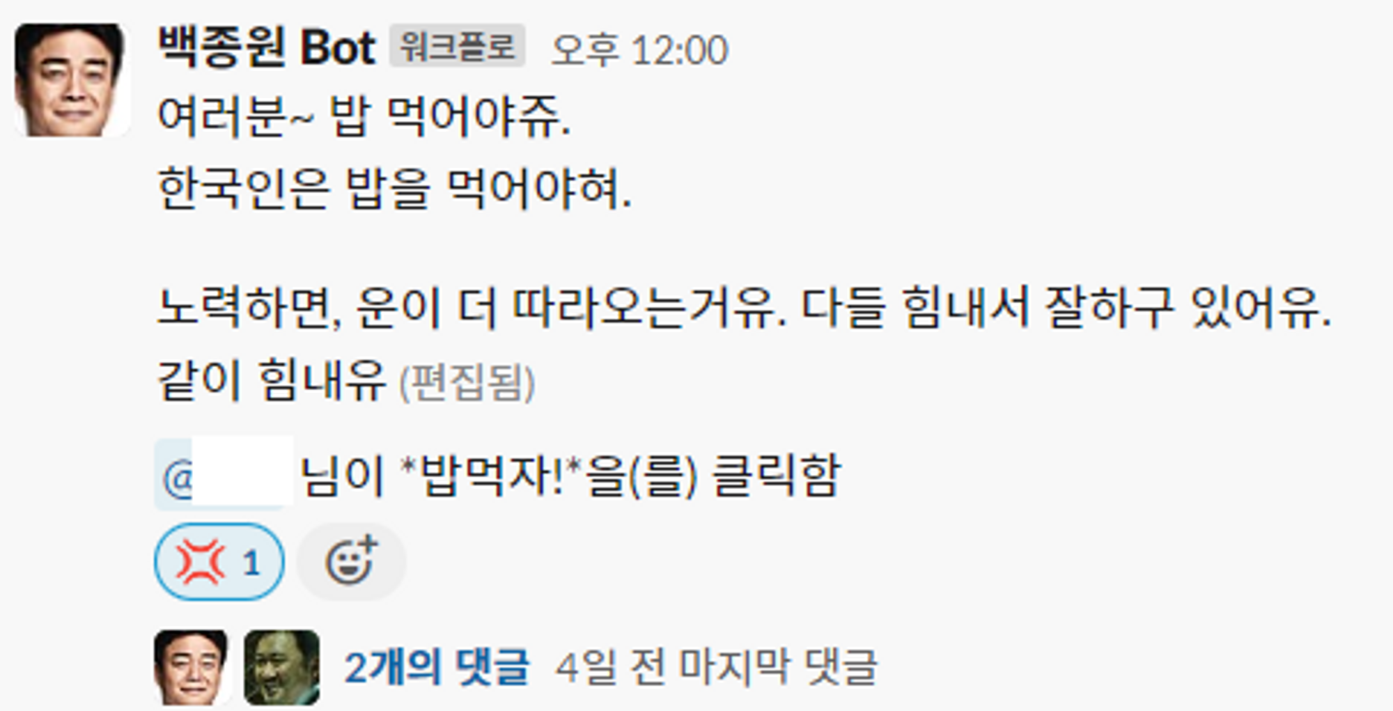 - 메세지 텍스트 [button클릭한 사용자] 맛밥하셔유~