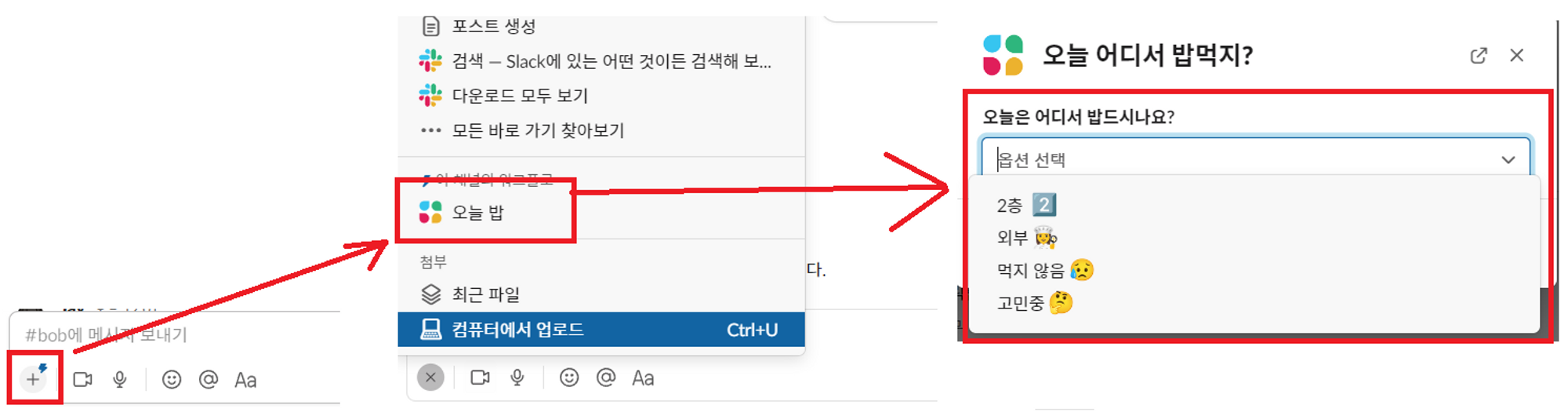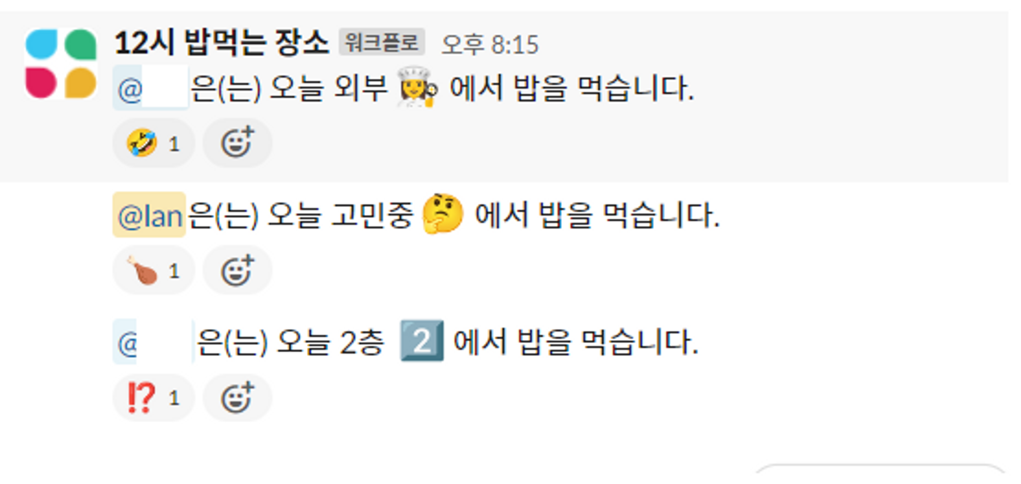 간단하게 버튼을 클릭해 오늘 식사 장소를 채널 내에 공유할 수 있습니다!