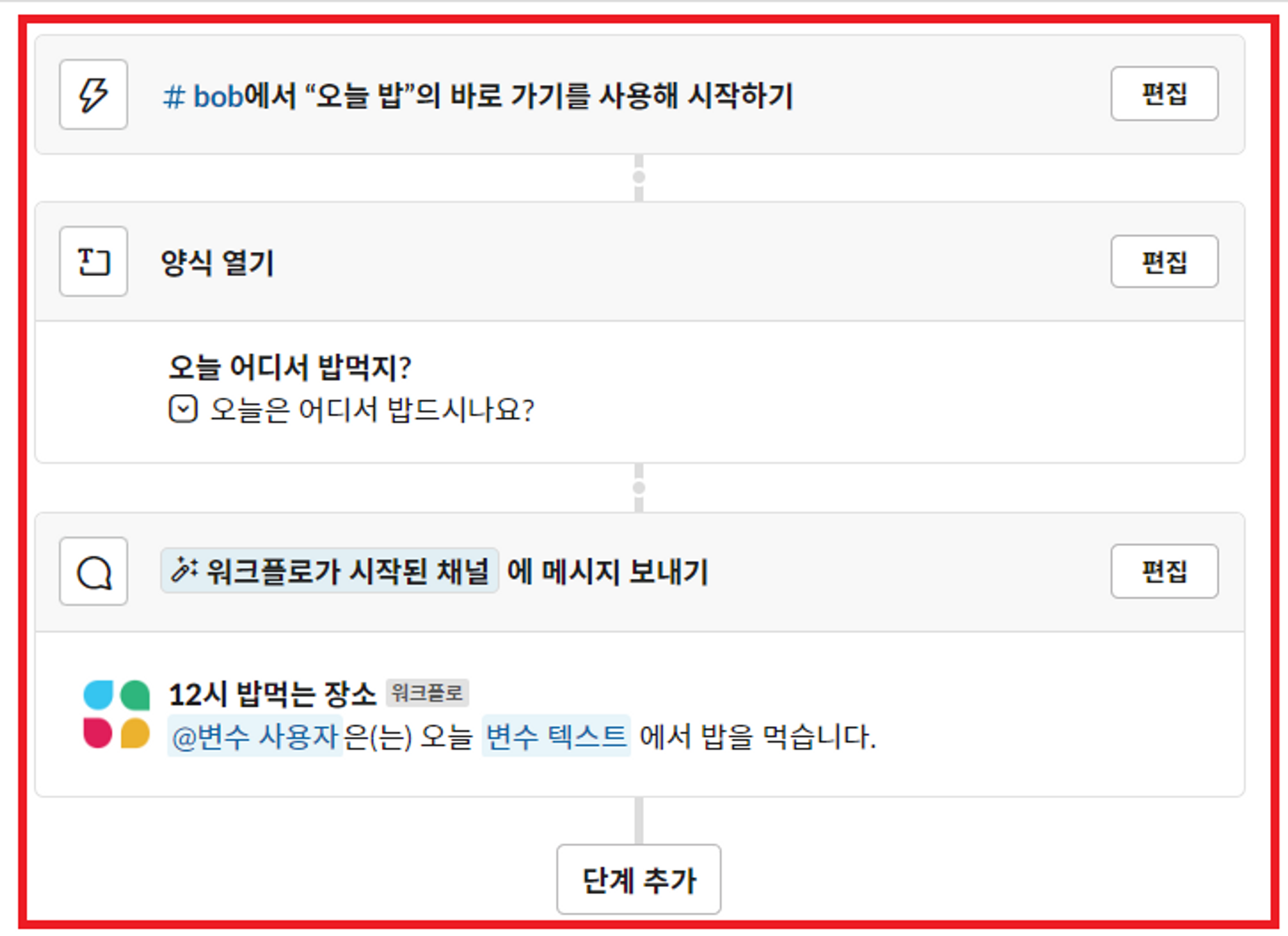 본 기능은, 개발툴인 아닌 슬랙 자체의 기능인 워크플로를 활용하여 만들었습니다.