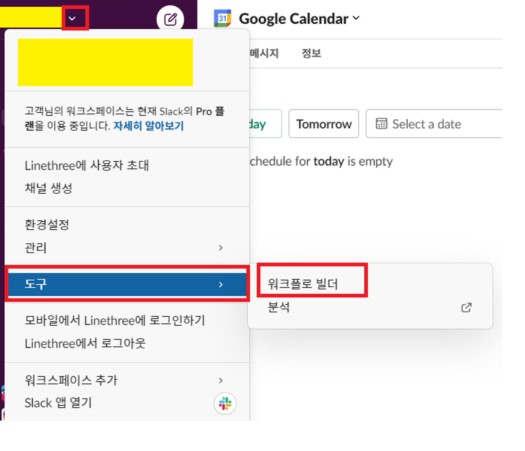 - 웹, 데스크탑 모두 왼쪽위의 회사명 옆에 드롭다운 버튼 클릭 → 도구 → 워크플로 빌더